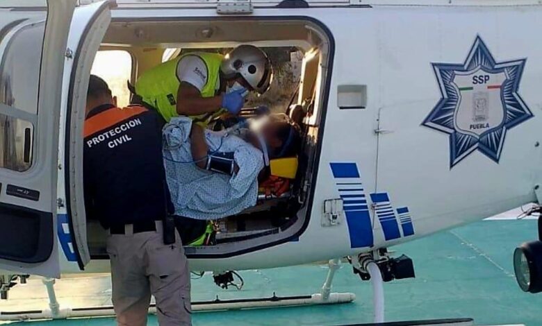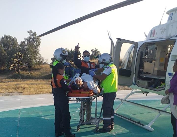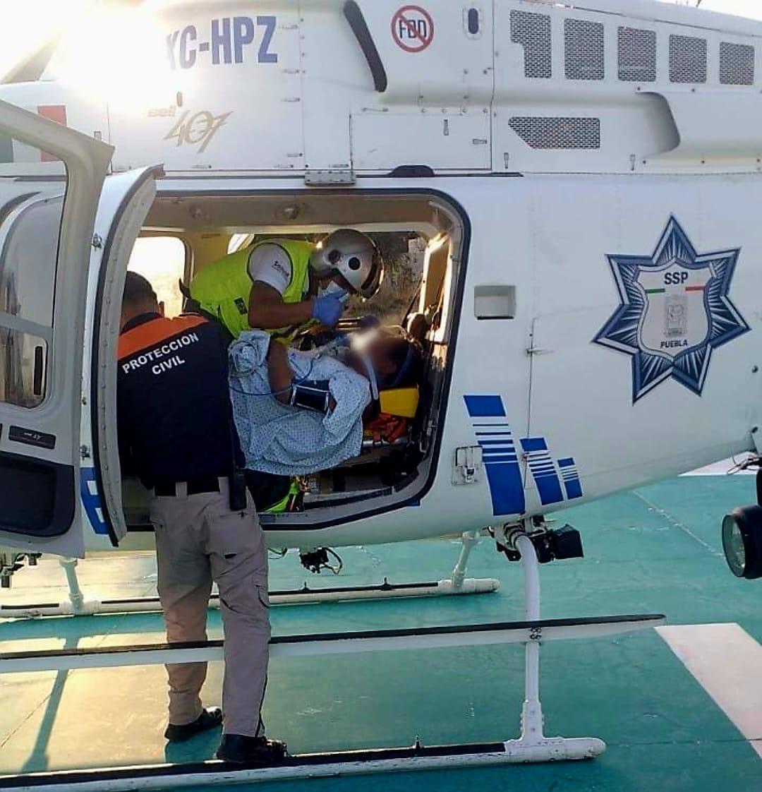 Debido a la complejidad de su cuadro clínico, fue trasladado en una ambulancia al helipuerto de la demarcación, para su referencia vía aérea por el Sistema de Urgencias Médicas Avanzadas (SUMA) al Hospital General de Cholula, en la ciudad de Puebla, unidad que recibió al paciente esta tarde para continuar con su atención médica especializada.