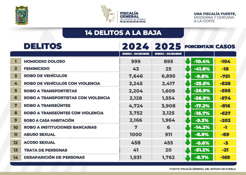 Durante el primer bimestre de 2026, la incidencia delictiva registró una disminución del siete por ciento en comparación con el mismo periodo de 2025, lo que se traduce en 21 delitos a la baja. «Tenemos la convicción plena, que nuestra responsabilidad coadyuvará con la seguridad, procurar la justicia y contribuir al desarrollo de la riqueza comunitaria», afirmó el gobernador de Puebla Alejandro Armenta Mier.