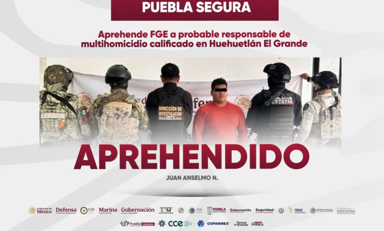 Como resultado de un operativo interinstitucional, autoridades lograron la captura de Juan Anselmo N., identificado como presunto implicado en el homicidio de seis personas en Huehuetlán El Grande.